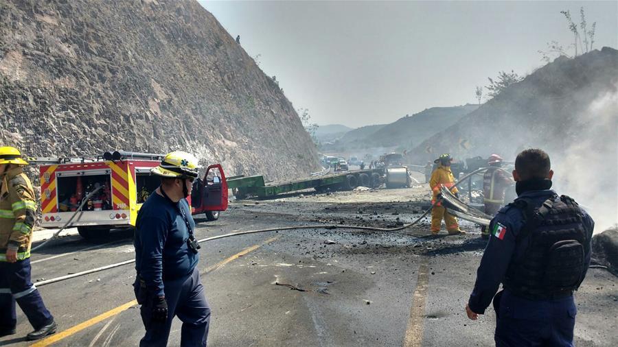 GUERRERO, abril 13, 2017 (Xinhua) -- Rescatistas laboran en el lugar donde se registró una colisión entre un autobús turístico y un camión cisterna, a la altura del kilómetro 300 de la autopista Siglo XXI, perteneciente a la localidad de Petacalco, en el estado de Guerrero, México, el 13 de abril de 2017. El saldo de la explosión de un camión pipa de combustible tras chocar con un autobús de pasajeros en una autopista en los límites de los estados de Guerrero y Michoacán, en el suroeste de México, aumentó el jueves a 24 muertos y 9 heridos, de acuerdo con las autoridades. (Xinhua/Str)