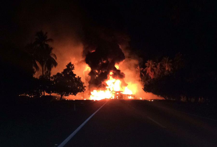 GUERRERO, abril 13, 2017 (Xinhua) -- Llamas consumen a un vehículo en el lugar donde se registró una colisión entre un autobús turístico y un camión cisterna, a la altura del kilómetro 300 de la autopista Siglo XXI, perteneciente a la localidad de Petacalco, en el estado de Guerrero, México, el 13 de abril de 2017. El saldo de la explosión de un camión pipa de combustible tras chocar con un autobús de pasajeros en una autopista en los límites de los estados de Guerrero y Michoacán, en el suroeste de México, aumentó el jueves a 24 muertos y 9 heridos, de acuerdo con las autoridades. (Xinhua/Str)