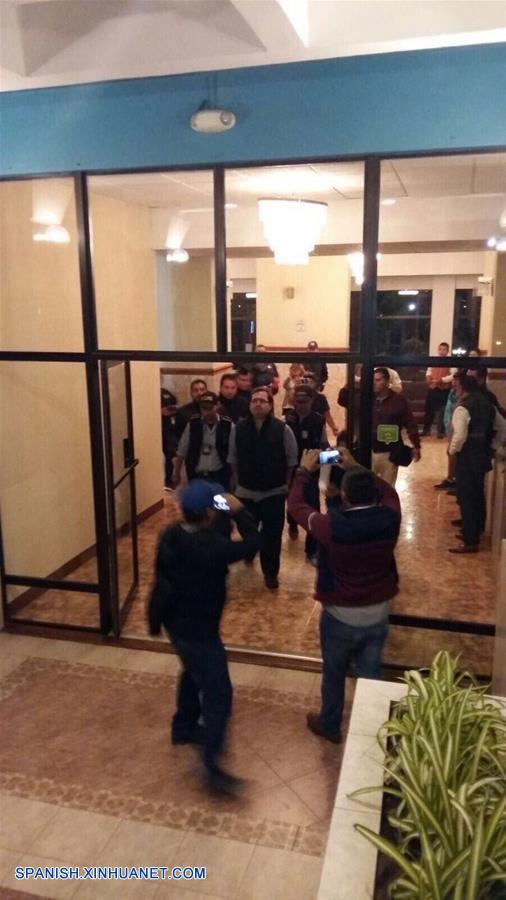 CIUDAD DE GUATEMALA, abril 15, 2017 (Xinhua) -- Imagen cedida por la Policía Nacional Civil de Guatemala tomada con un dispositivo móvil, del exgobernador del estado de Veracruz, Javier Duarte de Ochoa (c), siendo tralsadado luego de su detención en el municipio de Panajachel, en el departamento de Sololá, Guatemala, el 15 de abril de 2017. De acuerdo con información de la prensa local, la Procuraduría General de la República (PGR) informó el sábado en su cuenta de Twitter que Javier Duarte de Ochoa, exgobernador del estado de Veracruz, fue capturado con apoyo de la República de Guatemala. Duarte es acusado de delincuencia organizada, desvío de recursos públicos y manejo de recursos de procedencia ilícita. (Xinhua/Policía Nacional Civil de Guatemala)