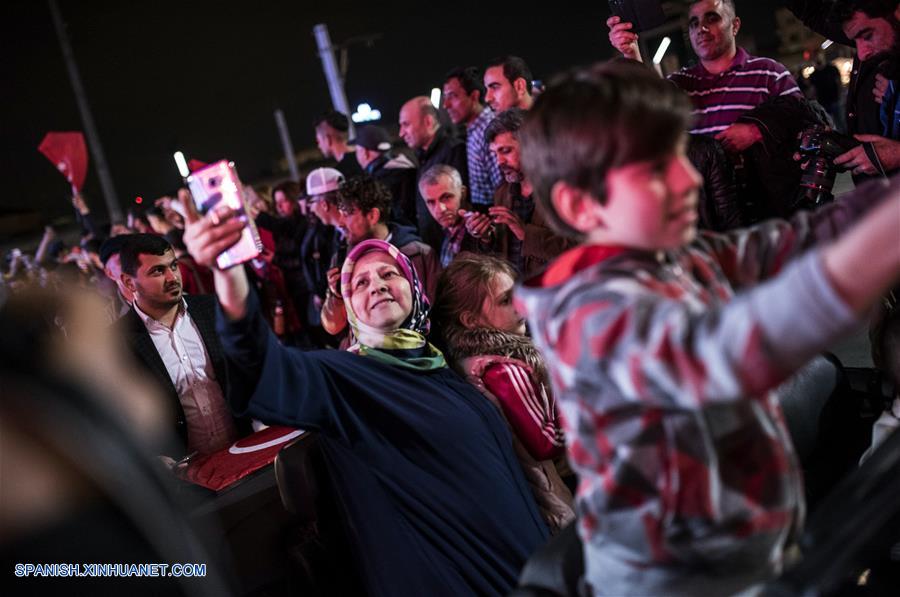 ESTAMBUL, abril 16, 2017 (Xinhua) -- Simpatizantes del gobernante Partido de la Justicia y el Desarrollo (AK) celebran la victoria del "Sí" en el referendo cerca de la Plaza Taksim en Estambul, Turquía, el 16 de abril de 2017. El primer ministro turco, Binali Yildirim, declaró durante la noche del domingo la victoria para el "Sí" en el referendo sobre las enmiendas constitucionales para abandonar el sistema parlamentario y adoptar un sistema presidencial en el país. (Xinhua/Depo Photos/ZUMAPRESS)