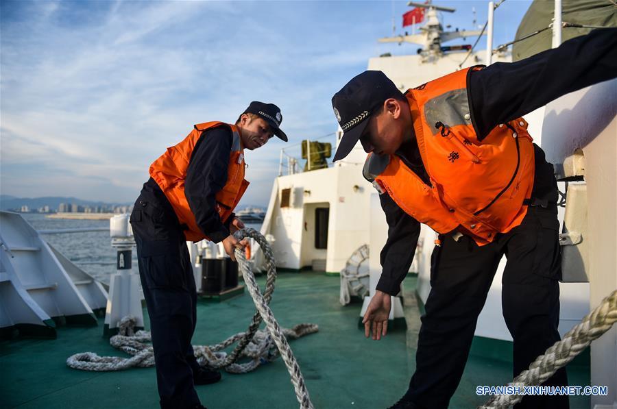 HAINAN, abril 17, 2017 (Xinhua) -- Miembros de la tripulación trabajan a bordo de un buque policial en Sanya, en la provincia de Hainan, en el sur de China, el 17 de abril de 2017. Dos buques de la policía marítima china salieron el lunes de Sanya para una inspección conjunta de las pesquerías entre China y Vietnam. La inspección, en el Golfo de Beibu, involucra a dos barcos de la policía de cada país, y se llevará a cabo durante tres días, terminando el jueves. Las inspecciones conjuntas comenzaron en 2006 como un evento anual, que aumentó a dos veces al a?o desde 2016. (Xinhua/Mao Siqian)