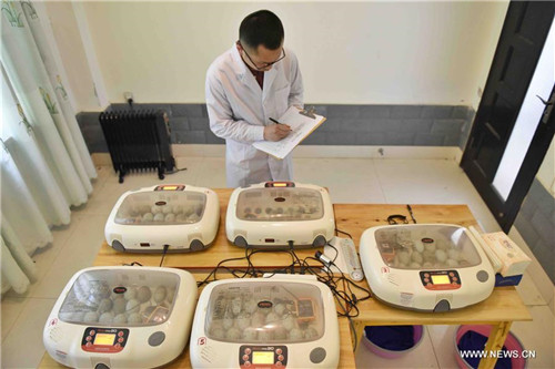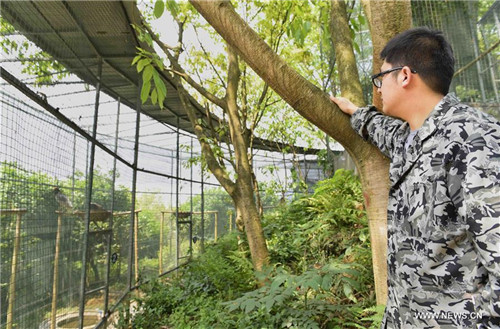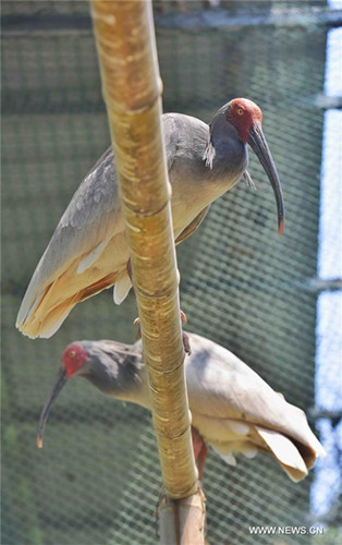 Dos Ibis con Cresta fueron encubados enel centro de cría artifical de la Academia Provincial de Ciencias de los Recursos Naturales de Sichuan, situada en Emeishan. 18 de junio del 2017. (Foto: Liu Kun)