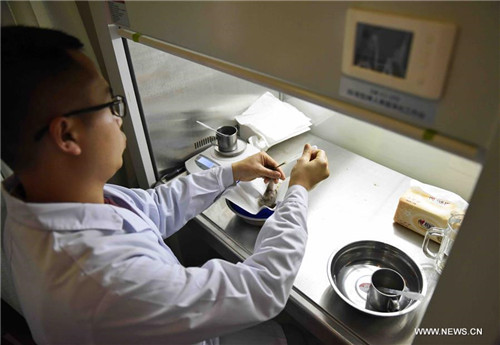 Un miembro del personal alimenta a un Ibis con Cresta en el centro de cría artifical de la Academia Provincial de Ciencias de los Recursos Naturales de Sichuan, situada en Emeishan, que fueron incubados en un centro de cría artificial para las especies en peligro de extinción. Los dos ejemplares pesaron 55,3 gy 51,7 gramos respectivamente, y se gozan de buena salud. Durante las últimas tres décadas, la población de Ibis con Cresta ha crecido de 7 ejemplares a más de 2.000 debido a los esfuerzos de conservación de China y sus instituciones científicas. Las aves en peligro de extinción tienen la máxima protección nacional.18 de junio del 2017. (Foto: Liu Kun)