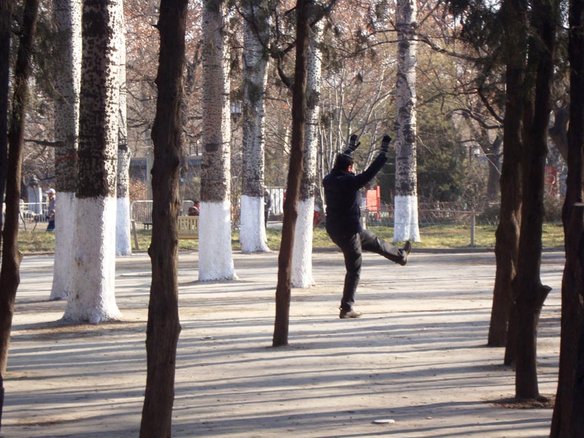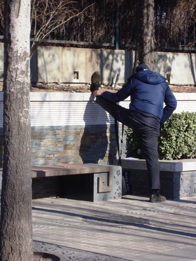 Algo que me ha sorprendido especialmente es que los chinos a menudo escogen los sitios más conspicuos para hacer ejercicio y estiramientos.