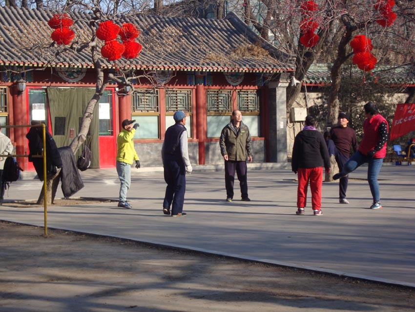 El Jianzi es un juego que no he visto en ningún otro lugar más que en China. Jianzi, o pluma china (de bádminton), es un deporte chino de origen antiguo que consiste en mantener la pluma en el aire dándole golpes con cualquier parte del cuerpo, a excepción de las manos.