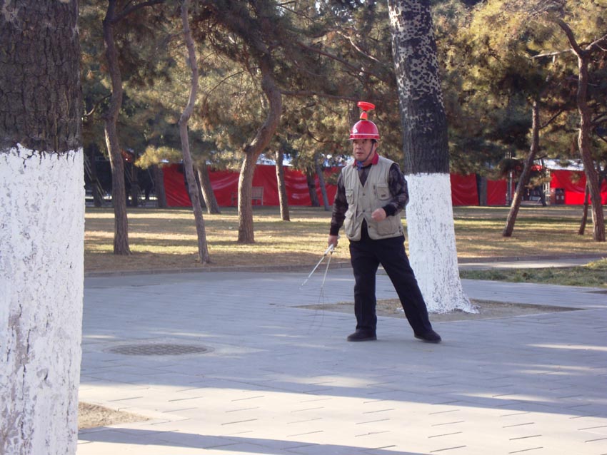 Un hombre haciendo equilibrio con un kongzhu en la cabeza en Ditan Park