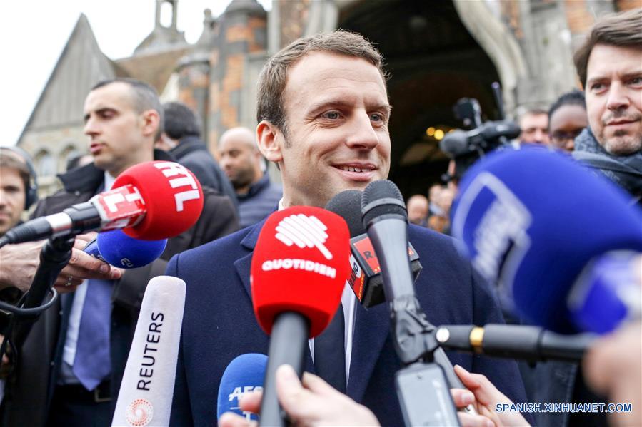 LE TOUQUET, abril 23, 2017 (Xinhua) -- El candidato a la presidencia de Francia por el movimiento En Marcha, Emmanuel Macron (c), conversa con representantes de los medios de comunicación después de emitir su voto en un centro electoral en Le Touquet, Francia, el 23 de abril de 2017. Los electores franceses han comenzado a acudir a las urnas la ma?ana del domingo para votar en la primera ronda de las elecciones presidenciales de Francia, consideradas "históricas" debido a que sus resultados tendrán un peso significativo para el futuro de Europa. (Xinhua/Soa Gontier)
