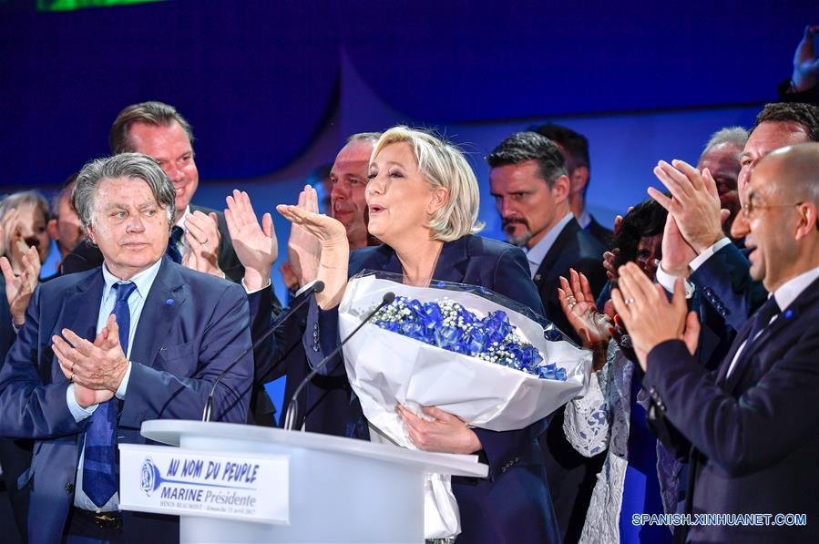 HENIN-BEAUMONT, abril 23, 2017 (Xinhua) -- La candidata a la presidencia de Francia por el partido de ultraderecha Frente Nacional (FN), Marine Le Pen (c), reacciona durante un evento posterior a la primera ronda de elecciones, en Henin-Beaumont, en Francia, el 23 de abril de 2017. El candidato centrista y ex ministro de Economía Emmanuel Macron y la candidata de extrema derecha, Marine Le Pen, encabezaron el domingo la primera ronda de la elección presidencial francesa, de acuerdo con proyecciones de diversas encuestadoras. Los dos candidatos que más votos consigan en la primera ronda participarán en la segunda vuelta del 7 de mayo. (Xinhua/Chen Yichen)
