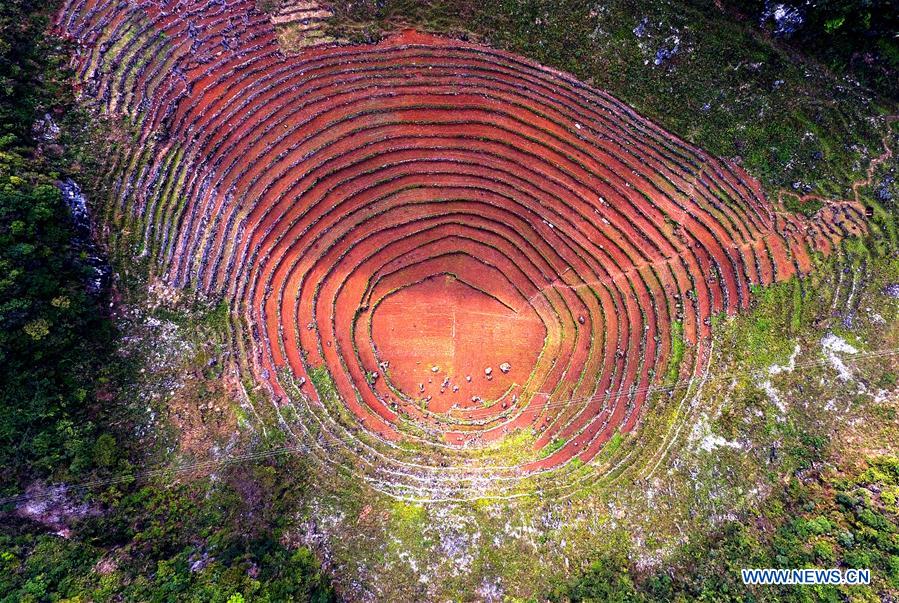 Foto del 24 de marzo de 2017 muestra los campos con forma de terrazas en espiral realizados con piedras en la aldea Nongcong del municipio Bansheng, en el condado autónomo de Dahua Yao. [Foto / Xinhua]