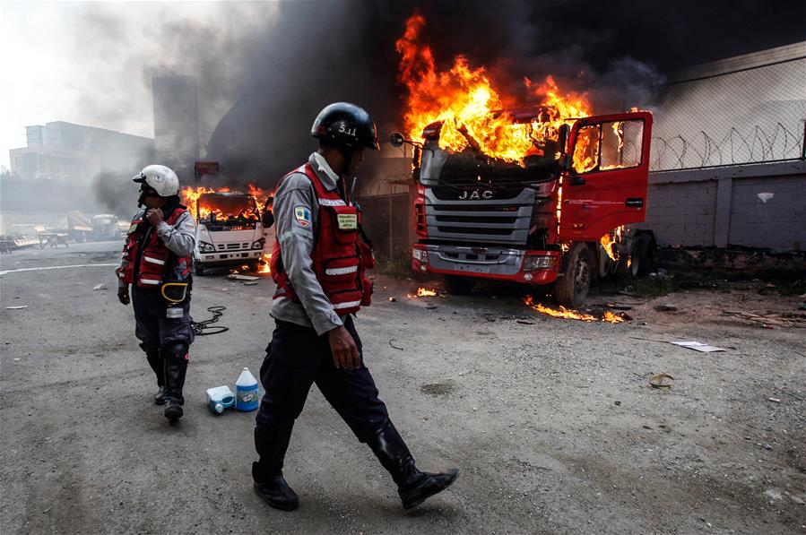 CARACAS, abril 24, 2017 (Xinhua) -- Bomberos reaccionan durante una protesta contra el gobierno del presidente venezolano, Nicolás Maduro, en Caracas, Venezuela, el 24 de abril de 2017. El vicepresidente del Partido Socialista Unido de Venezuela (PSUV), Diosdado Cabello, desestimó el lunes la petición de los sectores opositores de adelantar las elecciones generales previstas para 2018, pues este procedimiento no está previsto en la Constitución. (Xinhua/Boris Vergara)