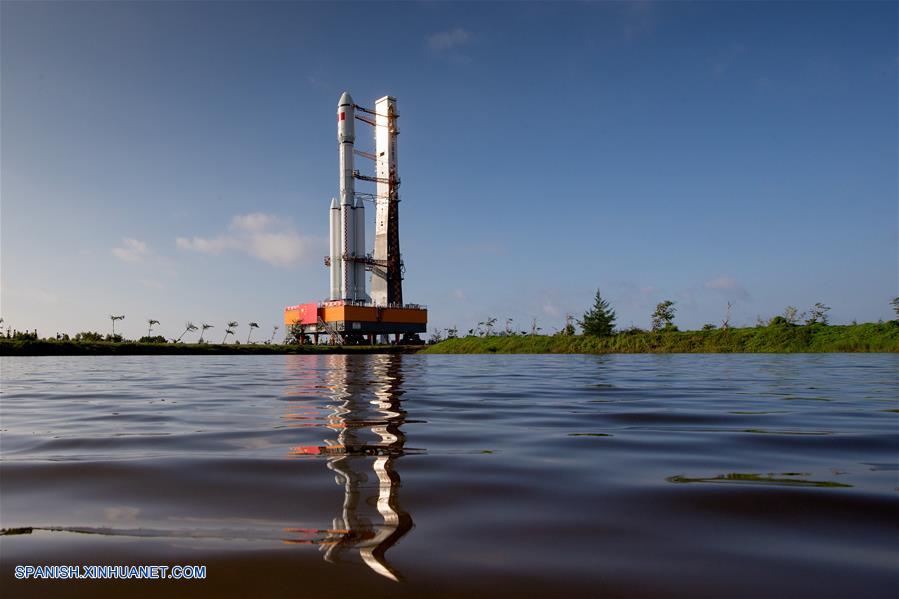 HAINAN, abril 17, 2017 (Xinhua) -- La nave espacial de carga de China, Tianzhou-1, es trasladada junto con un cohete portador Gran Marcha-7 Y2 desde el centro de pruebas a la zona de lanzamiento, en Wenchang, en la provincia de Hainan, en el sur de China, el 17 de abril de 2017. (Xinhua/Ju Zhenhua)