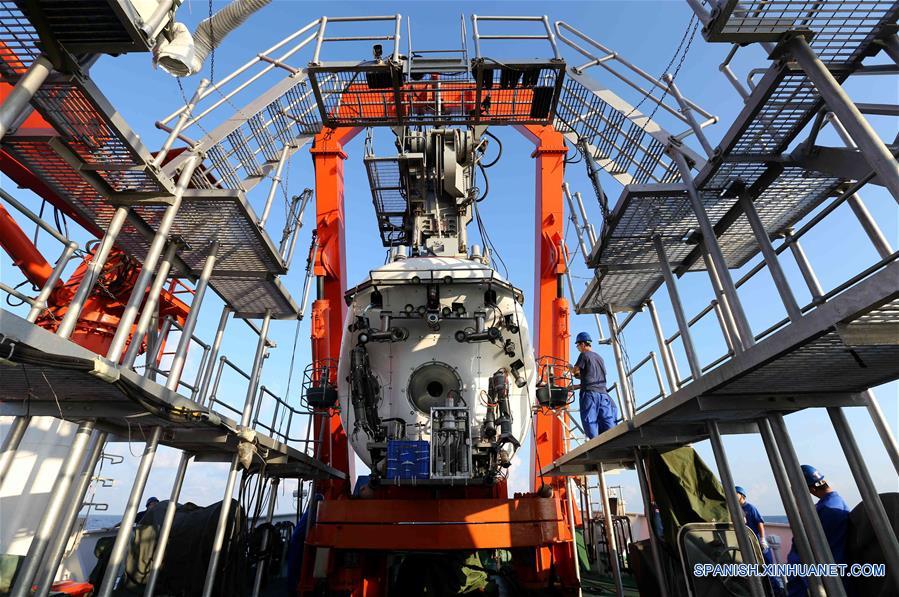 A BORDO DEL XIANGYANGHONG 09, abril 26, 2017 (Xinhua) -- El sumergible tripulado Jiaolong de China es preparado para su primera inmersión de este a?o en el Mar Meridional de China, en el sur de China, el 26 de abril de 2017. Un equipo científico chino se embarcó el martes en una misión de aguas profundas en el Mar Meridional de China, dando comienzo a la segunda fase de la 38 expedición oceánica de China. (Xinhua/Liu Shiping)
