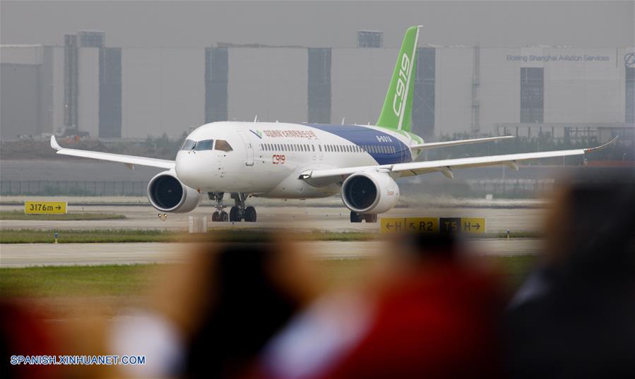 SHANGHAI, mayo 5, 2017 (Xinhua) -- El avión de pasajeros de gran tama?o construido en China C919, rueda sobre una pista previo a su vuelo inaugural, en Shanghai, en el este de China, el 5 de mayo de 2017. China ha visto el viernes el vuelo inaugural del C919, su primer gran avión de pasajeros desarrollado íntegramente en el país, lo que convierte a la nación asiática en uno de los gigantes mundiales de la aviación. (Xinhua/Fang Zhe)