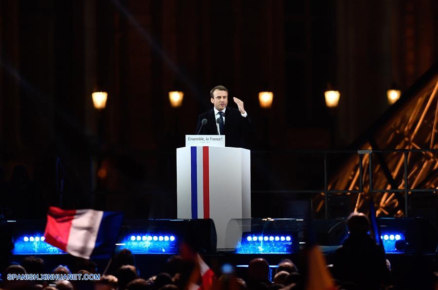 PARIS, mayo 7, 2017 (Xinhua) -- Emmanuel Macron, el candidato presidencial por el movimiento En Marcha, pronuncia un discurso frente al Museo del Louvre, en París, Francia, el 7 de mayo de 2017. El candidato centrista de Francia, Emmanuel Macron, ganó la segunda vuelta de la elección presidencial francesa el domingo, al derrotar a su rival de extrema derecha Marine Le Pen, de acuerdo con las primeras proyecciones después de la votación. (Xinhua/Chen Yichen)