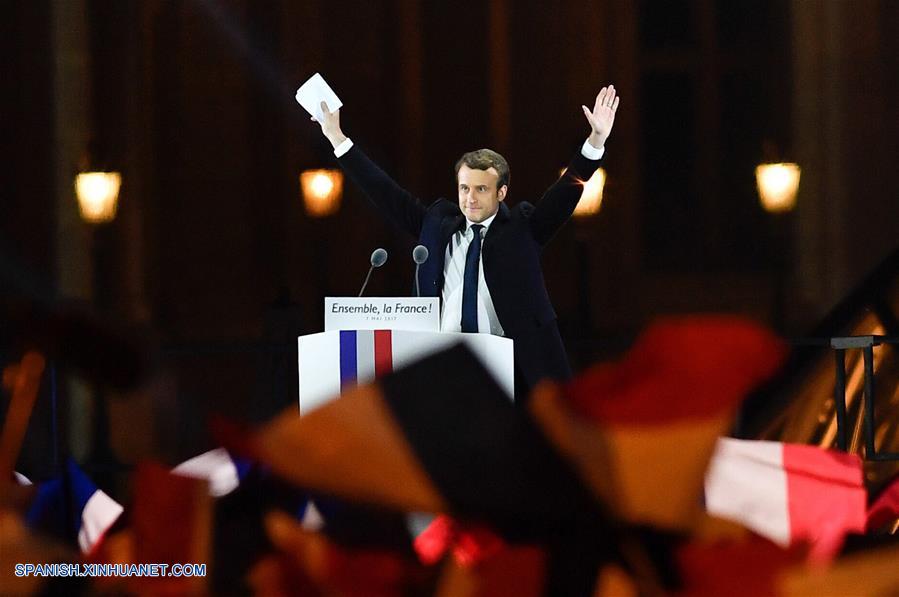 Emmanuel Macron, el candidato presidencial por el movimiento En Marcha, pronuncia un discurso frente al Museo del Louvre, en París, Francia, el 7 de mayo de 2017. (Xinhua/Chen Yichen)