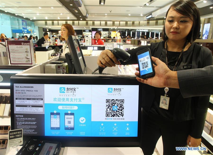 Una vendedora muestra cómo se usa el sistema Alipay en una tienda en el aeropuerto de Incheon en Seúl, Corea del Sur, el 6 de octubre de 2016. Es ya costumbre en China no llevar dinero en efectivo y pagar con un teléfono móvil, en que suelen estar instaladas las aplicaciones de Alipay o Wechat. Con un teléfono inteligente, la gente puede pagar en casi cualquier lugar, desde ir de compras, reparar el coche, pagar un taxi o registrarse en un hospital. En muchos otros países, el pago con Alipay y Wechat se está convirtiendo en una nueva tendencia. La empresa matriz de Alipay, Ant Financial Services Group o "Ant Financial", tiene más de 200 millones de usuarios en 25 países y regiones. Wechat, la mayor compa?ía de medios sociales de China, también ha penetrado en muchos países del mundo. (Xinhua / Ma Ping)