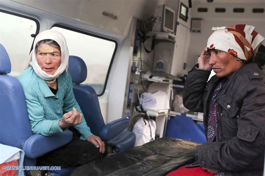 TAXKORGAN, mayo 11, 2017 (Xinhua) -- Residentes reciben tratamiento en la aldea Kuzigun en el condado de Taxkorgan, en la Región Autónoma Uygur de Xinjiang, en el noroeste de China, el 11 de mayo de 2017. Ocho personas murieron y 23 más resultaron heridas a causa de un terremoto de magnitud 5.5 que sacudió el jueves a las 5:58 (hora de Beijing) el distrito de Taxkorgan de la Región Autónoma Uygur de Xinjiang, en el noroeste de China, informaron fuentes locales. (Xinhua/Li Jing)
