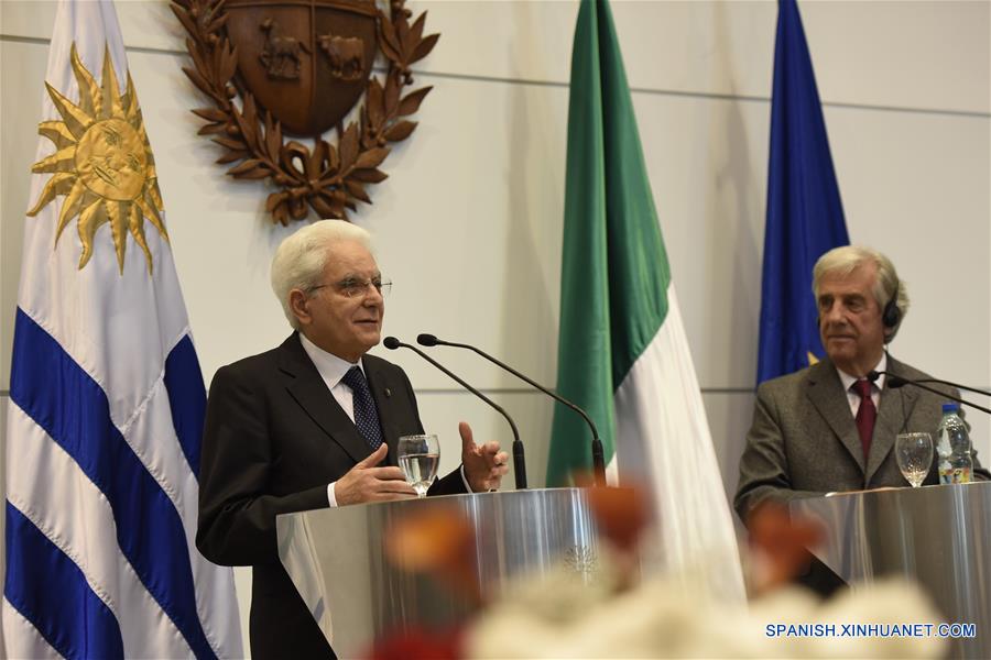 MONTEVIDEO, mayo 11, 2017 (Xinhua) -- El presidente uruguayo, Tabaré Vázquez (d), y su homólogo de Italia, Sergio Mattarella (i), participan durante una conferencia de prensa conjunta en la Torre Ejecutiva, en Montevideo, capital de Uruguay, el 11 de mayo de 2017. Los presidentes de Uruguay e Italia, Tabaré Vázquez y Sergio Mattarella, respectivamente, expresaron el jueves su optimismo de que el Mercado Común del Sur (Mercosur) y la Unión Europea (UE) aprobarán este a?o un acuerdo de libre comercio. (Xinhua/Nicolás Celaya)