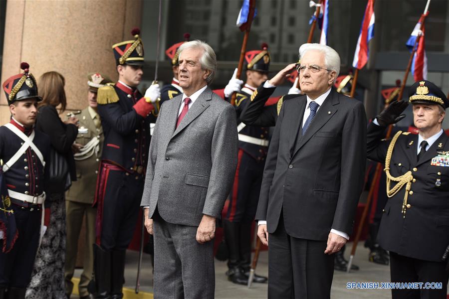 MONTEVIDEO, mayo 11, 2017 (Xinhua) -- El presidente uruguayo, Tabaré Vázquez (c), y su homólogo de Italia, Sergio Mattarella (2-d), participan durante una ceremonia de bienvenida en la Torre Ejecutiva, en Montevideo, capital de Uruguay, el 11 de mayo de 2017. Los presidentes de Uruguay e Italia, Tabaré Vázquez y Sergio Mattarella, respectivamente, expresaron el jueves su optimismo de que el Mercado Común del Sur (Mercosur) y la Unión Europea (UE) aprobarán este a?o un acuerdo de libre comercio. (Xinhua/Nicolás Celaya)