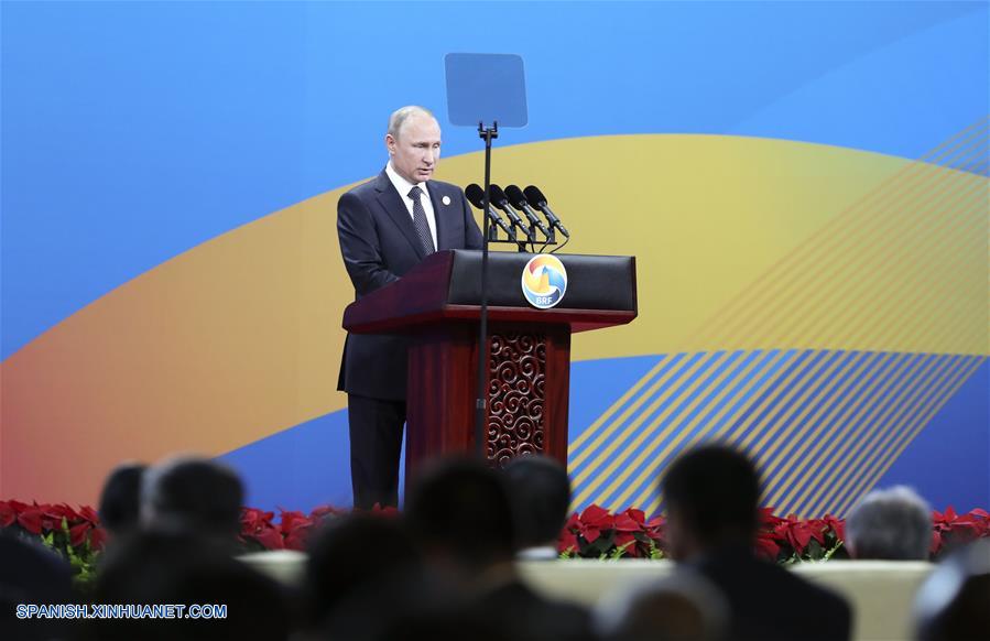 BEIJING, mayo 14, 2017 (Xinhua) -- El presidente de Rusia, Vladimir Putin, pronuncia un discurso durante la ceremonia de inauguración del Foro de la Franja y la Ruta para la Cooperación Internacional en Beijing, capital de China, el 14 de mayo de 2017. (Xinhua/Pang Xinglei)