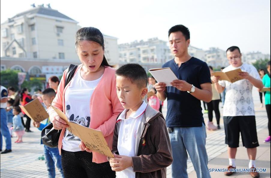 SHANDONG, mayo 14, 2017 (Xinhua) -- Un ni?o y su madre participan durante una actividad de lectura en vísperas de la celebración del Día de las Madres, en el condado Chiping de Liaocheng, provincia de Shandong, en el este de China, el 13 de mayo de 2017. (Xinhua/Zhang Zhenxiang)