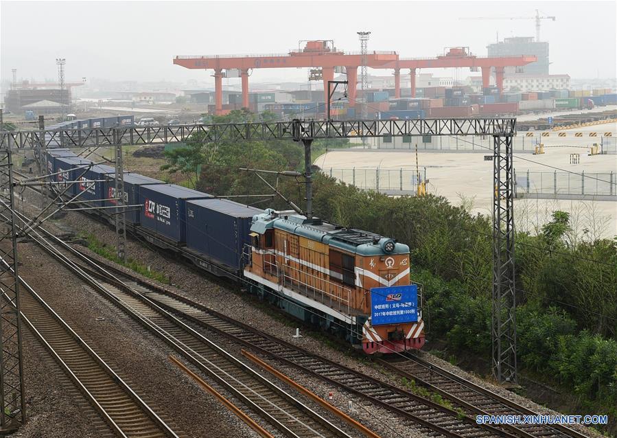 ZHEJIANG, mayo 14, 2017 (Xinhua) -- Imagen del 13 de mayo de 2017, del milésimo tren de carga que une a China y Europa este a?o partiendo de la Estación de Trenes Occidental de Yiwu, en Yiwu, en la provincia de Zhejiang, en el este de China. Desde el 1 de enero al 13 de mayo de 2017, el número de trenes de carga chino-europeos se ha incrementado en 612, o 158 por ciento, en comparación con el mismo periodo del a?o 2016, según China Railway Corp. (Xinhua/Gong Xianming)
