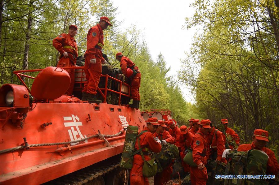 Policías forestales recogen equipo de un vehículo blindado en la bandera de Chenbaerhu, en la ciudad de Hulunbuir, en la Región Autónoma de Mongolia Interior, en el norte de China, el 20 de mayo de 2017. Un incendio forestal que comenzó el miércoles en la Región Autónoma de Mongolia Interior, en el norte de China, ha sido controlado gracias a un grupo de 8,000 bomberos, informaron el sábado las autoridades locales. (Xinhua/Deng Hua)