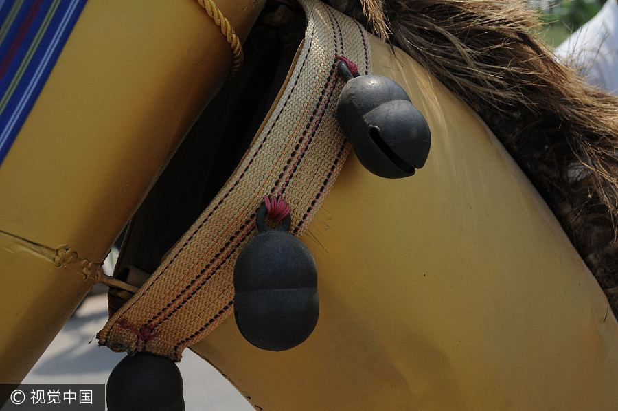 Un primer plano de los adornos en el cuello del caballo de hierro, en Anyang, provincia de Henan, el 18 de mayo de 2017. El caballo de hierro fue construido por Dong Xianchen, un agricultor en Anyang. [Foto / VCG]