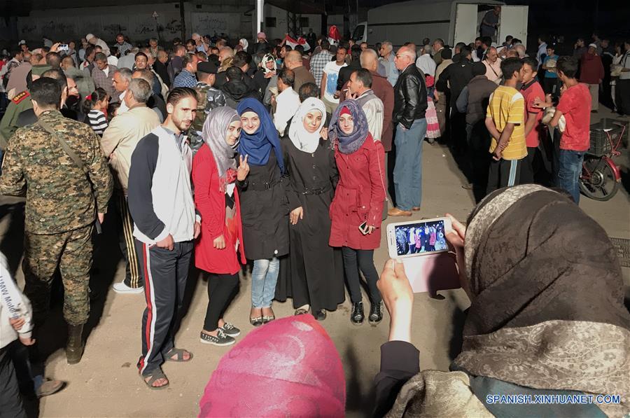 HOMS, mayo 21, 2017 (Xinhua) -- Residentes sirios posan en el barrio de al-Waer en la ciudad de Homs, Siria, el 21 de mayo de 2017. El último lote de rebeldes evacuaron el último cuartel en el barrio al-Waer, dejando toda la ciudad bajo el control del gobierno. Los últimos autobuses transportando a rebeldes y sus familiares, evacuaron el barrio de al-Waer, su último cuartel en la ciudad de Homs. (Xinhua/Hummam Sheikh Ali)