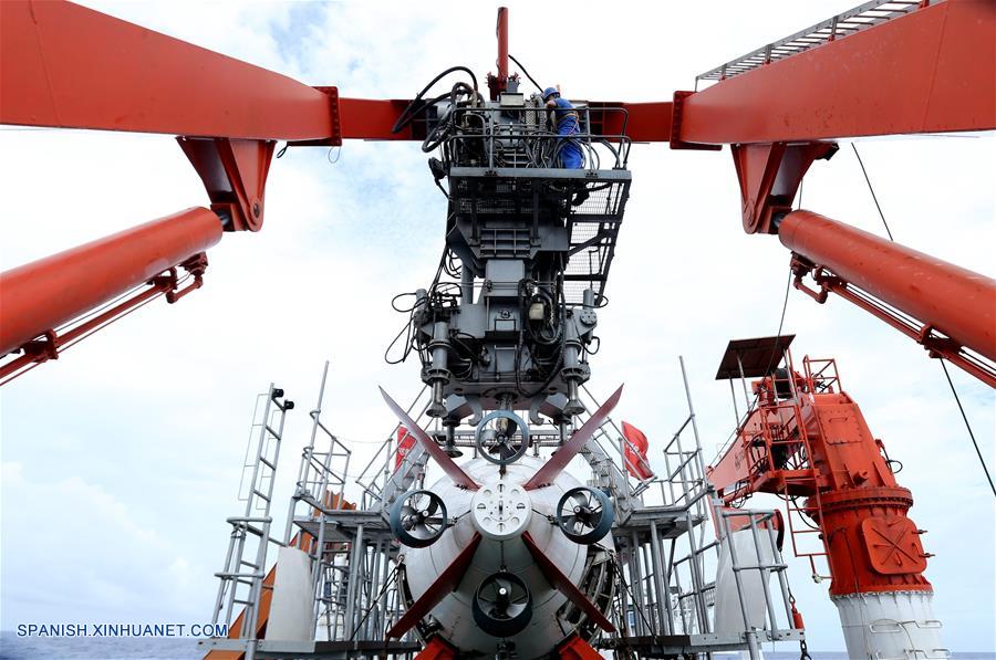 A BORDO DEL XIANGYANGHONG 09, mayo 22, 2017 (Xinhua) -- Técnicos se preparan para el Jiaolong, el sumergible tripulado chino, a bordo del barco Xiangyanghong 09, el 22 de mayo de 2017. El barco llegó el lunes a la zona de las Marianas y comenzó a probar la temperatura, salinidad y profundidad para la inmersión del martes en el Estrecho de las Marianas, la primera de la tercera fase de la expedición. (Xinhua/Liu Shiping)