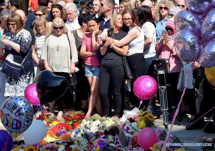 MANCHESTER, mayo 25, 2017 (Xinhua) -- Personas guardan un minuto de silencio en honor a las víctimas del atentado terrorista en la Manchester Arena, en la Plaza de St. Ann en Manchester, Reino Unido, el 25 de mayo de 2017. La policía sigue buscando a posibles terroristas y encontró artículos significativos para la investigación sobre el ataque en Manchester, se informó el jueves. (Xinhua/Andrew Parsons/i-Images/ZUMAPRESS)