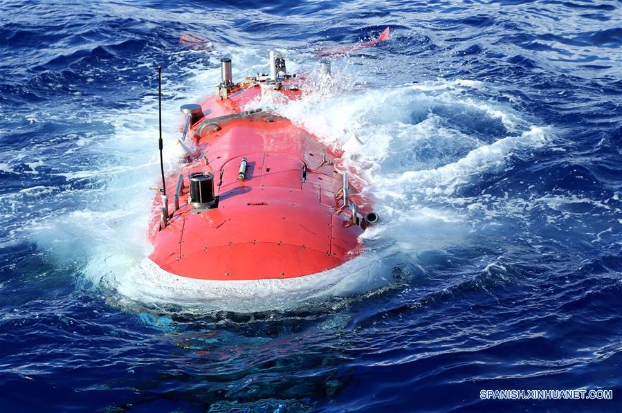 A BORDO DEL XIANGYANGHONG 09, mayo 30, 2017 (Xinhua) -- El sumergible tripulado chino Jiaolong sale a la superficie después de una inmersión en la Fosa de las Marianas, el 30 de mayo de 2017. El sumergible tripulado chino Jiaolong descendió el martes a 6.699 metros durante una misión en la Fosa de las Marianas. (Xinhua/Liu Shiping)