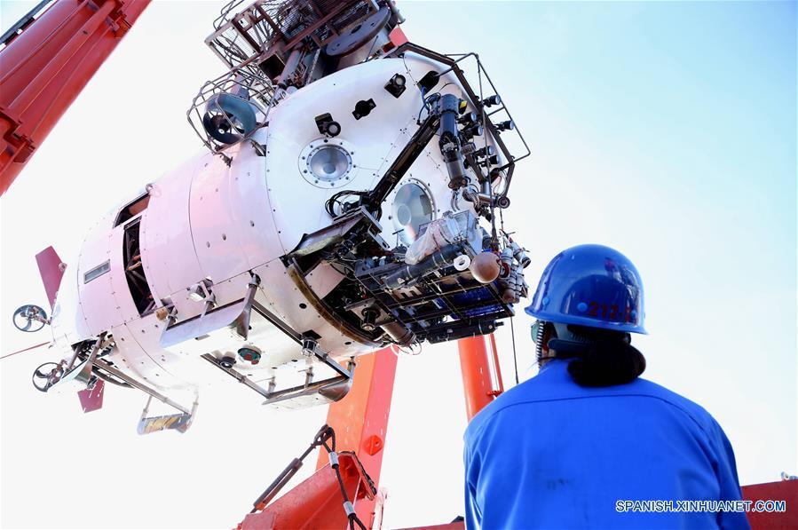 A BORDO DEL XIANGYANGHONG 09, mayo 30, 2017 (Xinhua) -- El sumergible tripulado chino Jiaolong es visto sobre su buque nodriza Xiangyanghong 09 después de una inmersión en la Fosa de las Marianas, el 30 de mayo de 2017. El sumergible tripulado chino Jiaolong descendió el martes a 6.699 metros durante una misión en la Fosa de las Marianas. (Xinhua/Liu Shiping)