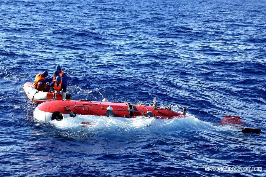 A BORDO DEL XIANGYANGHONG 09, mayo 30, 2017 (Xinhua) -- El sumergible tripulado chino Jiaolong sale a la superficie después de una inmersión en la Fosa de las Marianas, el 30 de mayo de 2017. El sumergible tripulado chino Jiaolong descendió el martes a 6.699 metros durante una misión en la Fosa de las Marianas. (Xinhua/Liu Shiping)