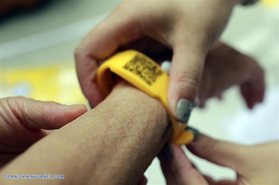 HUNAN, junio 3, 2017 (Xinhua) -- Una voluntaria ayuda a una mujer mayor a colocarse una pulsera con código de barras, en Hengyang, provincia de Hunan, en el centro de China, el 3 de junio de 2017. Utilizar un teléfono inteligente para escanear el código de barras sobre la pulsera ayudará a leer la información personal del titular. La pulsera está dise?ada para ayudar a las personas mayores en caso de que se pierdan y que sean incapaces de proporcionar información para contactar. (Xinhua/Liu Xiaofei)