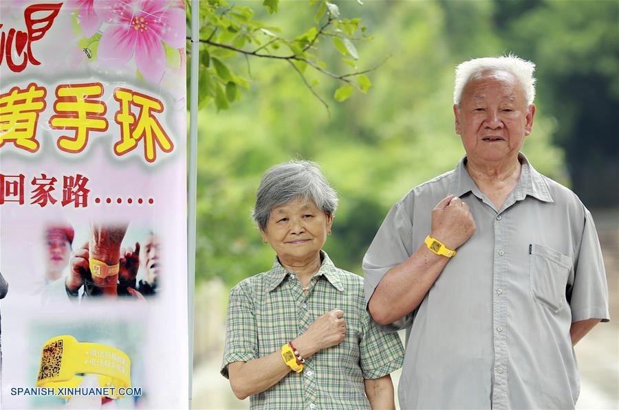 HUNAN, junio 3, 2017 (Xinhua) -- Dos personas mayores muestran pulseras con código de barras, en Hengyang, provincia de Hunan, en el centro de China, el 3 de junio de 2017. Utilizar un teléfono inteligente para escanear el código de barras sobre la pulsera ayudará a leer la información personal del titular. La pulsera está dise?ada para ayudar a las personas mayores en caso de que se pierdan y que sean incapaces de proporcionar información para contactar. (Xinhua/Liu Xiaofei)