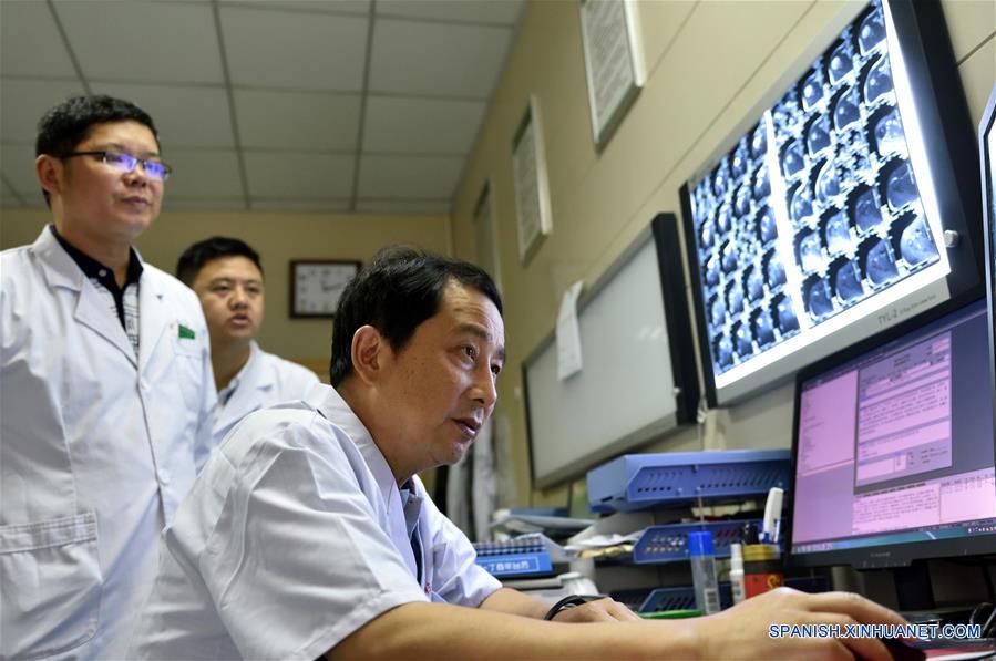 Imagen del 24 de mayo de 2017 del cirujano Mei Changqing (d), observando imágenes de resonancia magnética nuclear en el Hospital del Pueblo del condado de Zigui, provincia de Hubei, en el centro de China. Mei Changqing es uno de los que se beneficiaron de la reanudación del examen de ingreso a la universidad en 1977. El cirujano, siendo un tipógrafo en 1976 luego de su graduación de la secundaria, cambió su destino realizado el examen de ingreso a la universidad en 1977 y fue matriculado por la Escuela de Medicina de Yichang. Habiendo estado dedicado a la medicina clínica durante 30 a?os, Mei Changqing está orgulloso de su elección. (Xinhua/Wang Jiaman)