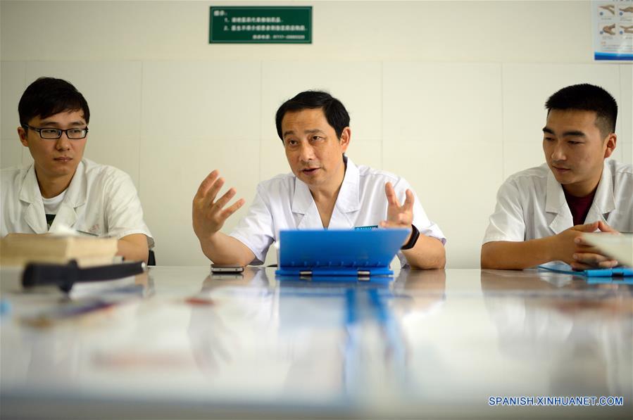 HUBEI, junio 3, 2017 (Xinhua) -- El cirujano Mei Changqing (c), discute casos con sus colegas en el Hospital del Pueblo del condado de Zigui, provincia de Hubei, en el centro de China, el 3 de junio de 2017. Mei Changqing es uno de los que se beneficiaron de la reanudación del examen de ingreso a la universidad en 1977. El cirujano, siendo un tipógrafo en 1976 luego de su graduación de la secundaria, cambió su destino realizado el examen de ingreso a la universidad en 1977 y fue matriculado por la Escuela de Medicina de Yichang. Habiendo estado dedicado a la medicina clínica durante 30 a?os, Mei Changqing está orgulloso de su elección. (Xinhua/Lei Yong)