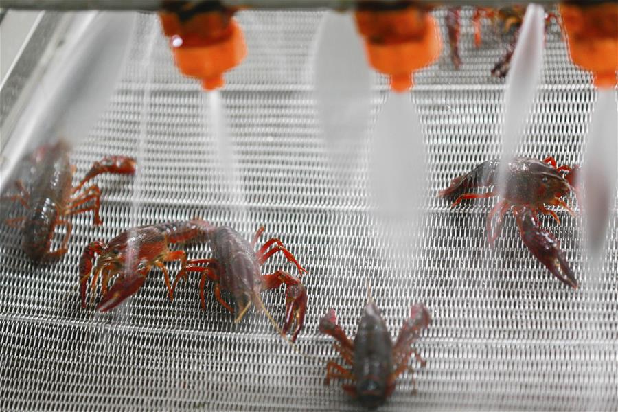 JIANGSU, junio 4, 2017 (Xinhua) -- Un equipo automatizado lava cangrejos de río en una compa?ía de alimentos en el condado de Xuyi, en la provincia de Jiangsu, en el este de China, el 4 de junio de 2017. Con la innovación de productos y la promoción de la logística de las cadenas de frío, el valor de producción anual de cangrejos de río del país ha superado los diez millones de yuanes. (Xinhua/Zhou Haijun)