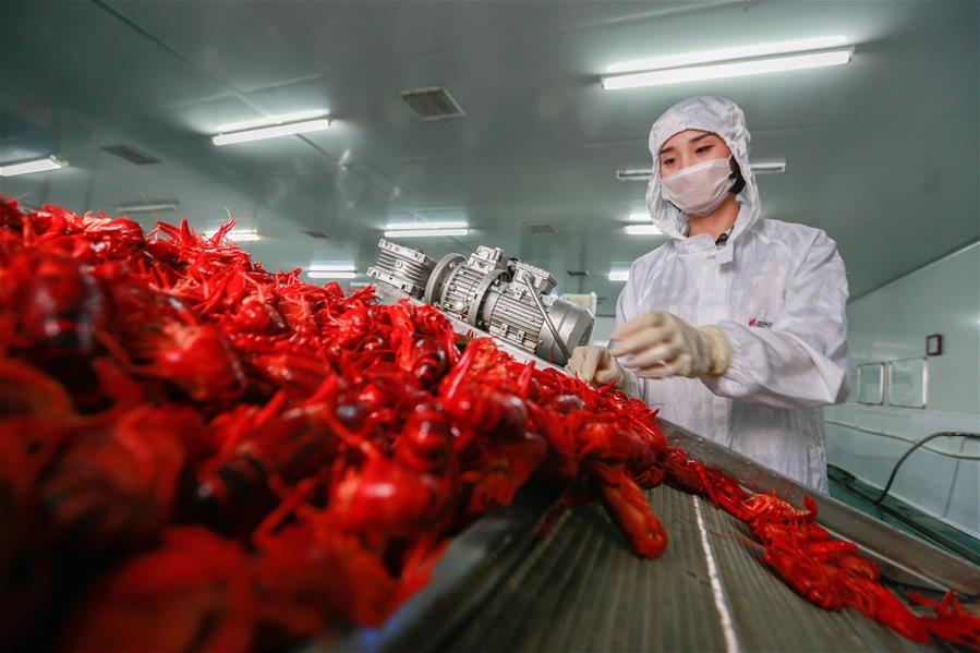 JIANGSU, junio 4, 2017 (Xinhua) -- Una trabajadora procesa cangrejos de río en una compa?ía de alimentos en el condado de Xuyi, en la provincia de Jiangsu, en el este de China, el 4 de junio de 2017. Con la innovación de productos y la promoción de la logística de las cadenas de frío, el valor de producción anual de cangrejos de río del país ha superado los diez millones de yuanes. (Xinhua/Zhou Haijun)