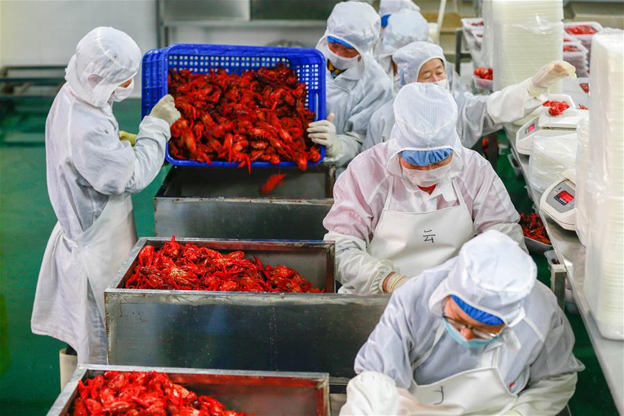 JIANGSU, junio 4, 2017 (Xinhua) -- Trabajadores procesan cangrejos de río en una compa?ía de alimentos en el condado de Xuyi, en la provincia de Jiangsu, en el este de China, el 4 de junio de 2017. Con la innovación de productos y la promoción de la logística de las cadenas de frío, el valor de producción anual de cangrejos de río del país ha superado los diez millones de yuanes. (Xinhua/Zhou Haijun)