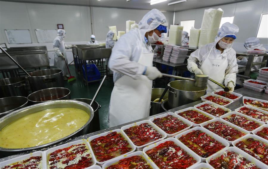 JIANGSU, junio 4, 2017 (Xinhua) -- Trabajadores cocinan cangrejos de río en una compa?ía de alimentos en el condado de Xuyi, en la provincia de Jiangsu, en el este de China, el 4 de junio de 2017. Con la innovación de productos y la promoción de la logística de las cadenas de frío, el valor de producción anual de cangrejos de río del país ha superado los diez millones de yuanes. (Xinhua/Zhou Haijun)