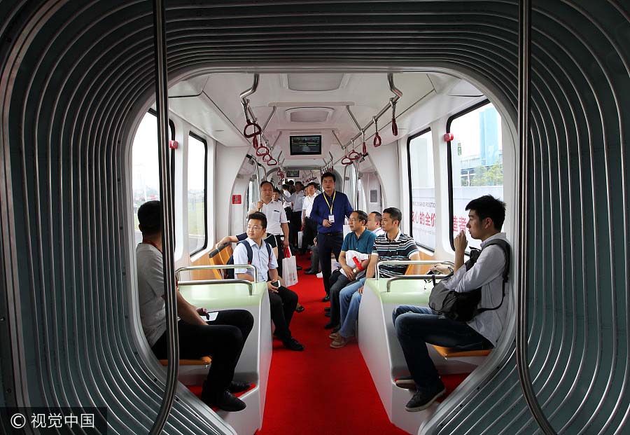 Los visitantes prueban con entusiasmo el primer tren sin raíl en Zhuzhou, provincia de Hunan, el 2 de junio de 2017. [Foto / VCG]