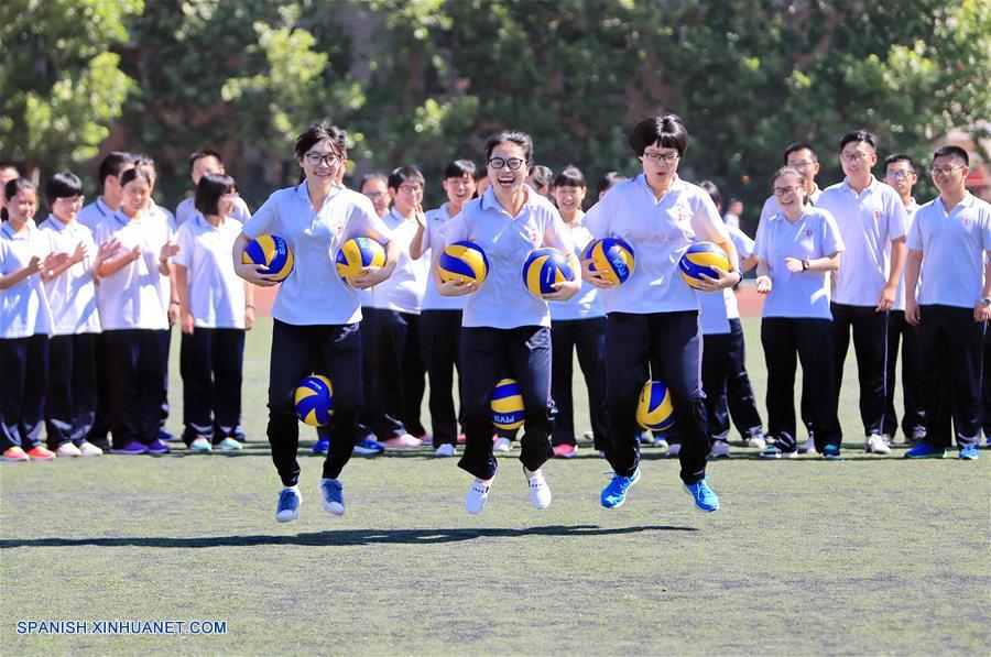 HEBEI, junio 6, 2017 (Xinhua) -- Candidatos del examen nacional de ingreso a la universidad participan en una actividad al aire libre para relajarse en la Escuela Secundaria No. 2, en Hengshui, provincia de Hebei, en el norte de China, el 6 de junio de 2017. Un total de 9,4 millones de estudiantes de secundaria chinos realizarán el examen nacional de ingreso a la universidad 2017, conocido como Gaokao, debido a que comienza el miércoles, informó el Ministerio de Educación. (Xinhua/Mu Yu)