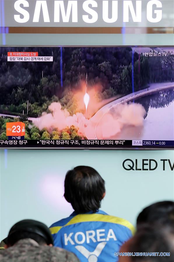 Personas observan las noticias en una estación de trenes en Seúl, República de Corea, el 8 de junio de 2017. La República Popular Democrática de Corea (RPDC) hizo el jueves una prueba de lanzamiento de múltiples proyectiles, que se cree son misiles de crucero, hacia sus aguas orientales, dijo la oficina del Estado Mayor Conjunto de Corea del Sur. (Xinhua/Lee Sang-ho)