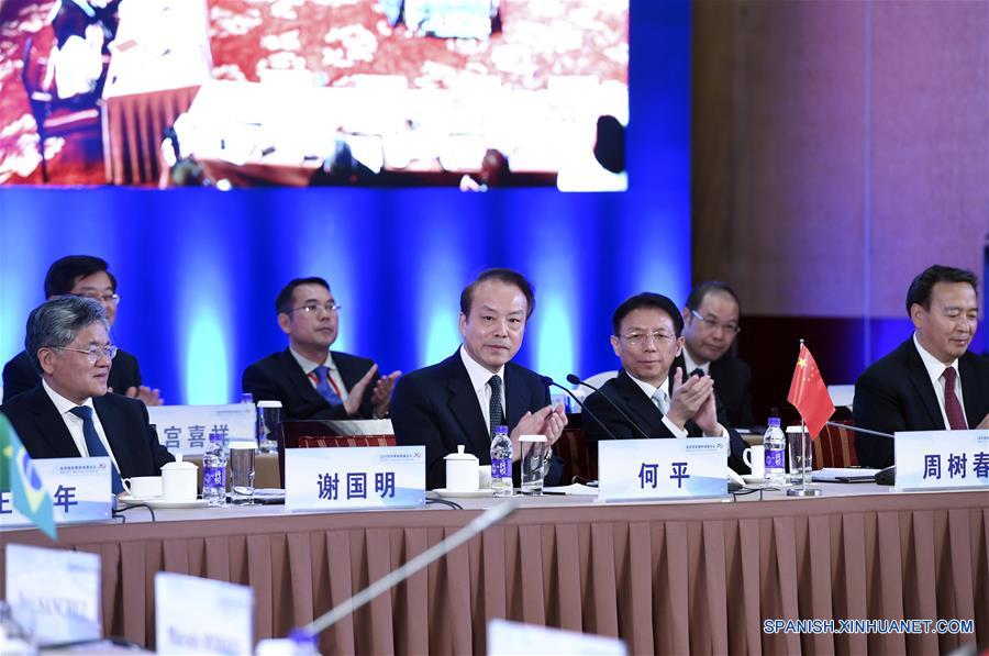 BEIJING, junio 8, 2017 (Xinhua) -- He Ping (2-i-frente), editor en jefe de la Agencia de Noticias Xinhua, preside la ceremonia de clausura del Foro de Medios del BRICS, en Beijing, capital de China, el 8 de junio de 2017. El Foro de Medios de los países del grupo de los BRICS concluyó el jueves con la aprobación de un plan de acción por los líderes de 27 grupos de medios de comunicación para promover la cooperación entre sí. (Xinhua/Zhang Ling)