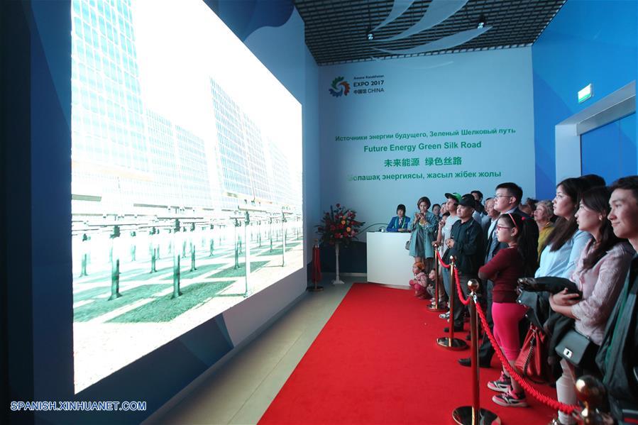 ASTANA, junio 10, 2017 (Xinhua) -- Personas observan un cortometraje sobre el Pabellón de China de la Expo Mundial 2017 en la sección de "el Prefacio" en Astaná, Kazajistán, el 10 de junio de 2017. El Pabellón de China de la Expo Mundial 2017 se inauguró el sábado en la capital kazaja de Astaná, que destaca los logros de China en el desarrollo, la utilización y la protección de nuevas energías. (Xinhua/Lu Jinbo)