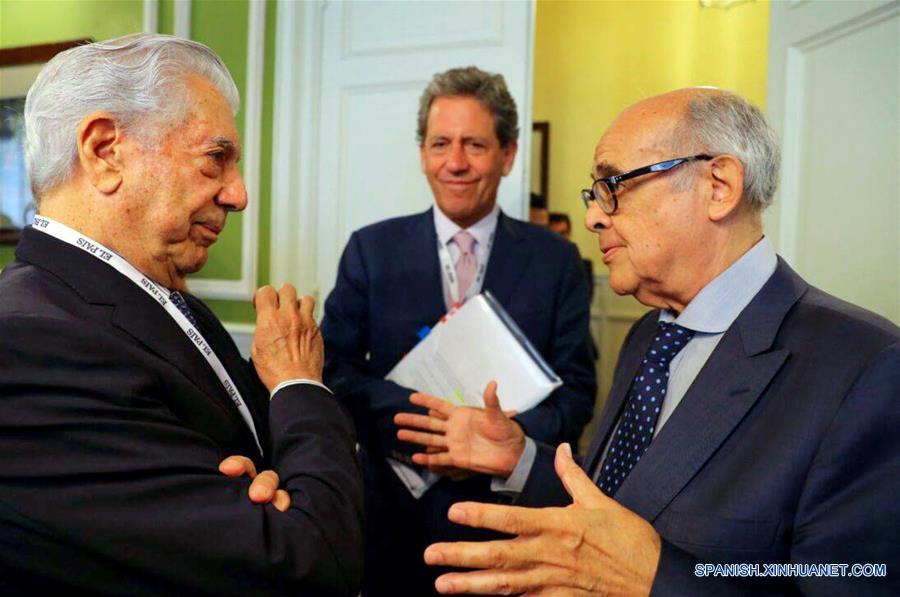 El escritor peruano, Mario Vargas LLosa (i), conversa con el ministro de Relaciones Exteriores de Perú, Ricardo Luna Mendoza (d), durante el foro "El Perú del Futuro" en Madrid, Espa?a, el 12 de junio de 2017. De acuerdo con información de la prensa local, el presidente de Perú, Pedro Pablo Kuczynski, se encuentra en una visita de Estado a Espa?a, para reunirse con el presidente del Gobierno espa?ol, Mariano Rajoy, y fortalecer las relaciones bilaterales y promover las inversiones en Perú, además de participar en el foro "El Perú del Futuro", organizado por el diario espa?ol El País. (Xinhua/Andrés Valle/ANDINA)