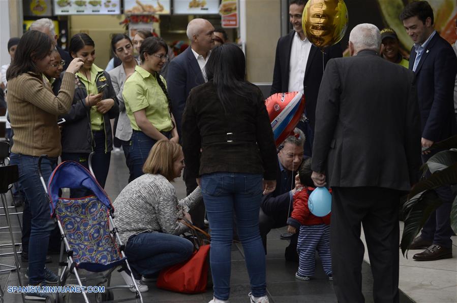 Imagen cedida por la Presidencia de Colombia, del presidente colombiano Juan Manuel Santos (d-abajo), saludando a un ni?o durante un encuentro con ciudadanos que visitaron el Centro Comercial Andino de Bogotá, en Bogotá, capital de Colombia, el 18 de junio de 2017. (Xinhua/Juan David Tena/Presidencia de Colombia)