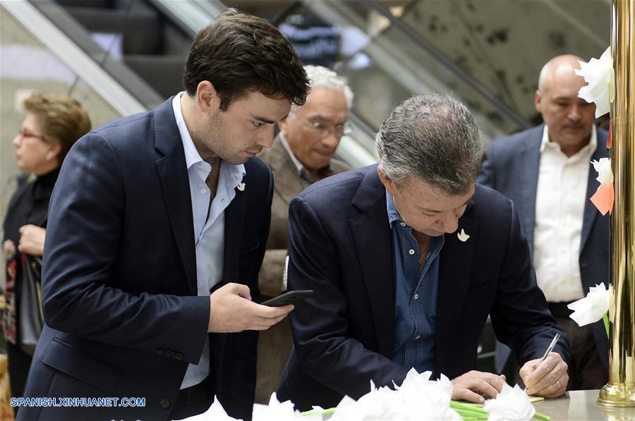 Imagen cedida por la Presidencia de Colombia, del presidente colombiano Juan Manuel Santos (d), escribiendo un mensaje durante un encuentro con ciudadanos que visitaron el Centro Comercial Andino de Bogotá, en Bogotá, capital de Colombia, el 18 de junio de 2017. (Xinhua/Juan David Tena/Presidencia de Colombia)